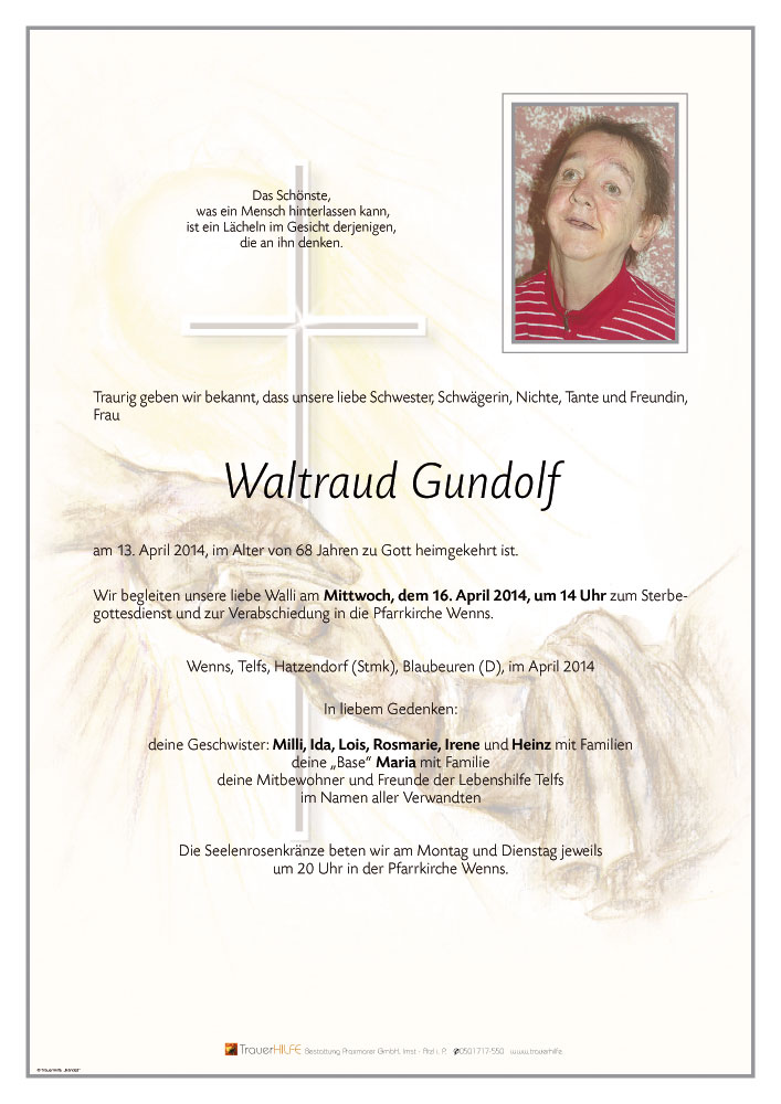 • Liebe Trauerfamilie! Unser Aufrichtiges Beileid zum Heimgang von eurer Schwester Waltraud .Ehemalige Nachbarskinder Renate und Elisabeth . Engel sollen dich begleiten .