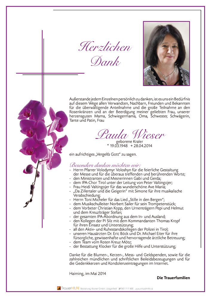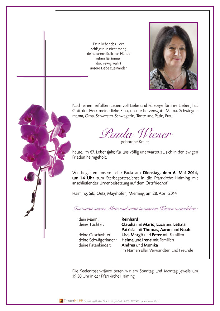 Der Trauerfamilie besonders dir Reinhard wünschen wir viel Trost und Kraft in den schweren Tagen.03.05.2014 12:16 - Lisa u.Herbert aus dem Pitztal