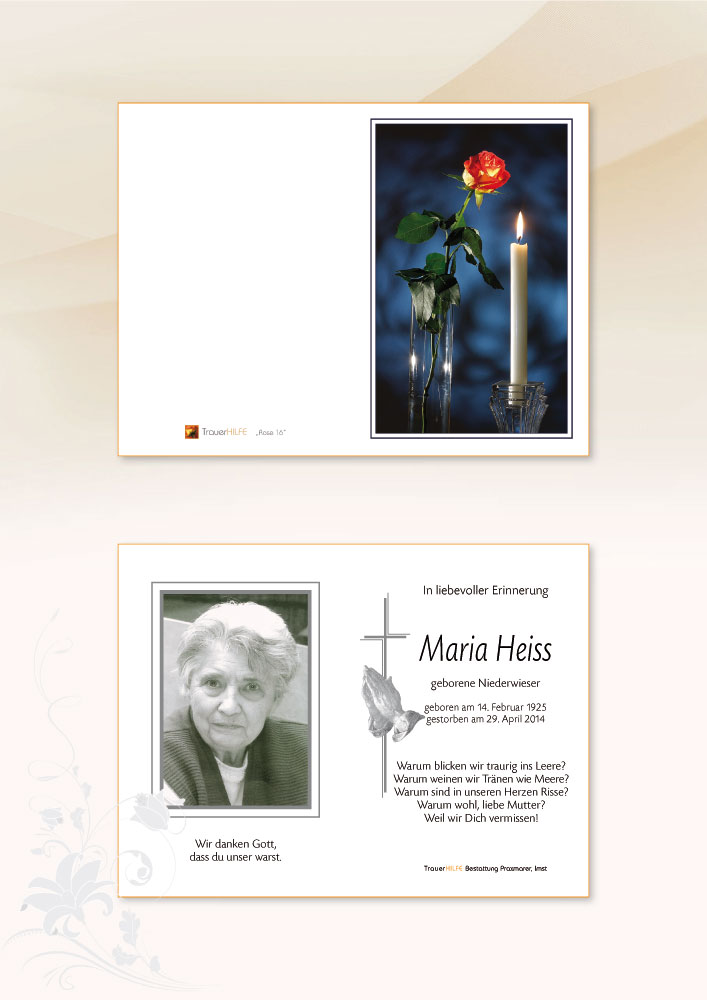 Liebe Maria! Ich werde duch nie vergessen, du warst ein besonderer Mensch! Nun bist du erlöst!! Ich wünsche deinen Angehörigen viel Kraft! Ruhe in Frieden!
