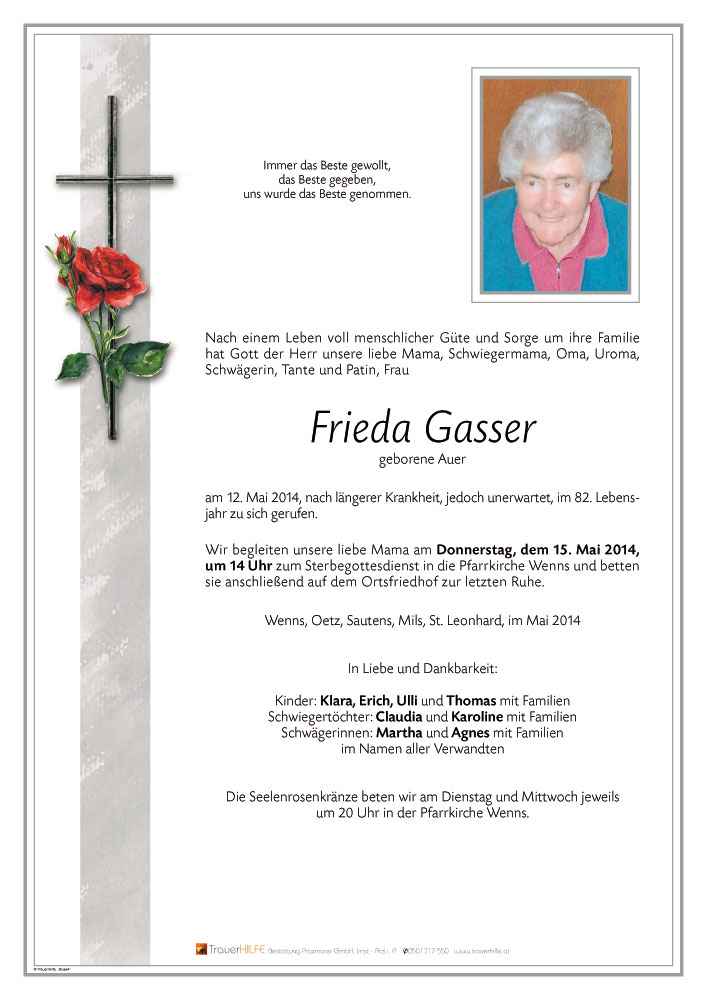 Zum schmerzlichen Verlust eurer lieben Mama mein aufrichtiges Beileid und viel Kraft für die schwere Zeit.13.05.2014 15:26 - Knabl Andrea mit Familie
