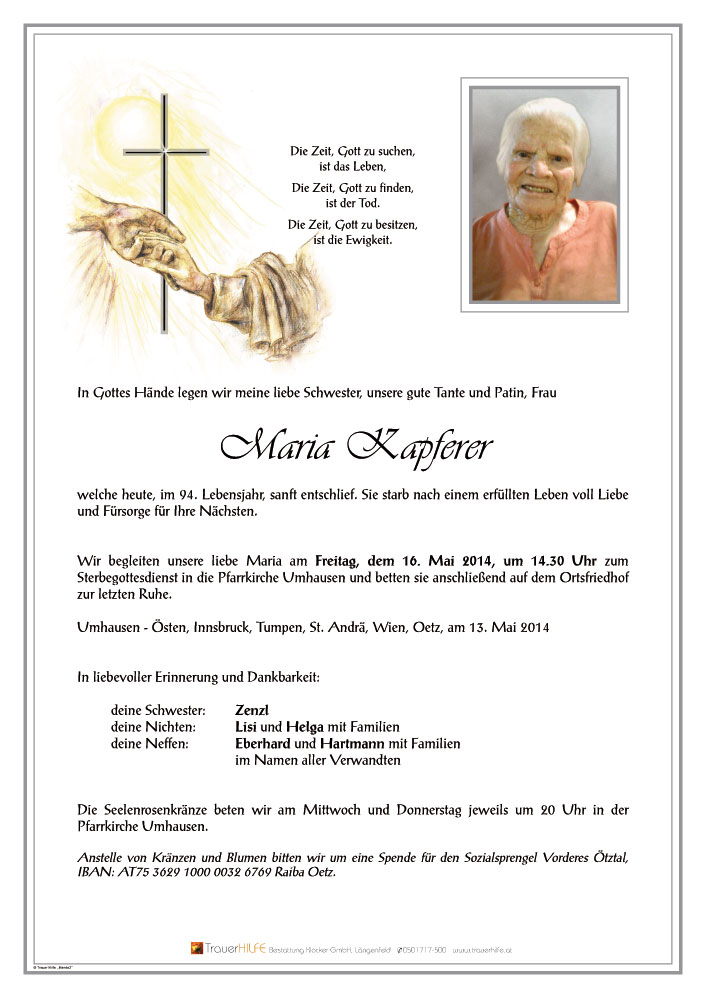 Neue Kerze für Maria Kapferer entzünden.