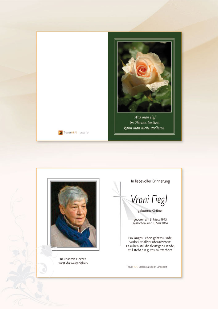 Eine liebe Seele lässt euch etwas da wenn sie geht. Eine kleine helle Blume pflanzt sie in eure Herzen und wenn es an der Zeit ist öffnet sich diese und schenkt euch Blüte für Blüte, Erinnerungen an einen wunderbaren Menschen. Auferstehung ist unser Glaube,Wiedersehen unsere Hoffnung