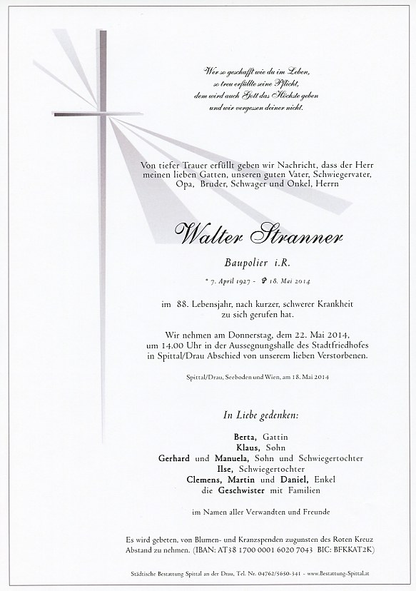 Bestattung wurde durchgeführt von: Gerald Baumgartner/Franz Kramaritsch/Sylvia Wippl Gerald Baumgartner/Franz Kramaritsch/Sylvia Wippl Städtische Bestattungsanstalt Spittal an der Drau Edlinger Straße 55 9800 - Spittal an der Drau Tel.: 04762 5650341 zum Bestatter