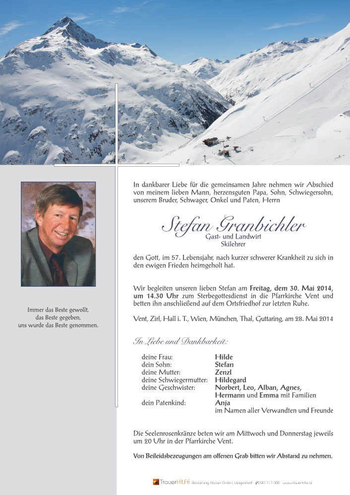 Das Leben muss weiter gehen. Wir Venter vermissen unseren Stefan sehr, aber er will auch nicht das wir das ganze Leben um ihn trauern. Jeden Tag sollten wir an ihn denken und hoffen, dass es ihn oben, weit oben bei Gott gut geht. Sogar die Gáste trauern um Stefan, was heißt das er immer ein guter Freund, ein guter Gastgeber und auch ein sehr guter Vater. Ruhe in Frieden Stefan. Ich wünsche Hilde und Stefan jr. noch eine glückliche Zeit und wie gesagt für euch zwei geht das Leben weiter. Liebe, liebe Grüße und mein Beileid Markus