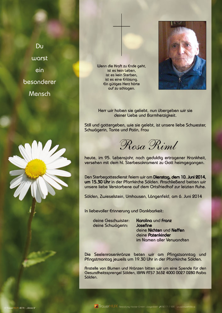 Rosa du warst immer für jeden da, immer ein freundliches Wort. Überall hast du mitgeholfen. Bescheiden war deine Art und dein Wesen . Jetzt ist die Zeit gekommen auf die andere Seite der Türe zu gehen. ... Pfiti Rosa ... ich werde dich immer in guter Erinnerung behalten . Ruhe in Gottes Frieden08.06.2014 01:00 - Anna Fender