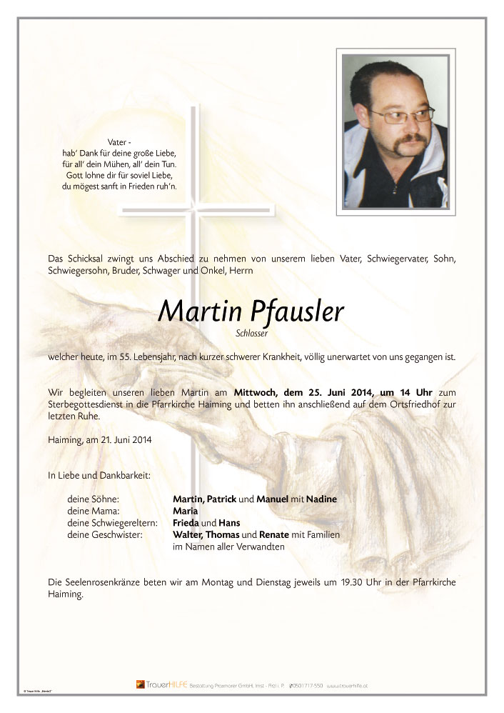 Lb.Trauerfamilie,ich durfte die letzten Tage mit Martin als Bettnachbar in Zams verbringen.Martin ist ruhig eingeschlafen.Ich wünsche der ganzen Familie viel Kraft. Toni