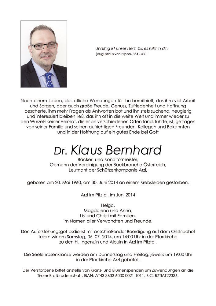 Mit größter Hochachtung und Respekt weiß ich Deine von tiefem Glauben und Perfektionismus getragenen Initiativen für die Pfarre Arzl zu schätzen. Ganz besonders denke ich dabei an jene Zeit, in der es durch Deinen Einsatz gelungen ist, ein Team von Liturgen ausbilden, die in unserer Pfarre die Verkündigung des Wortes Gottes mittragen konnten. Lieber Klaus, vielen Dank und Ruhe in Frieden.