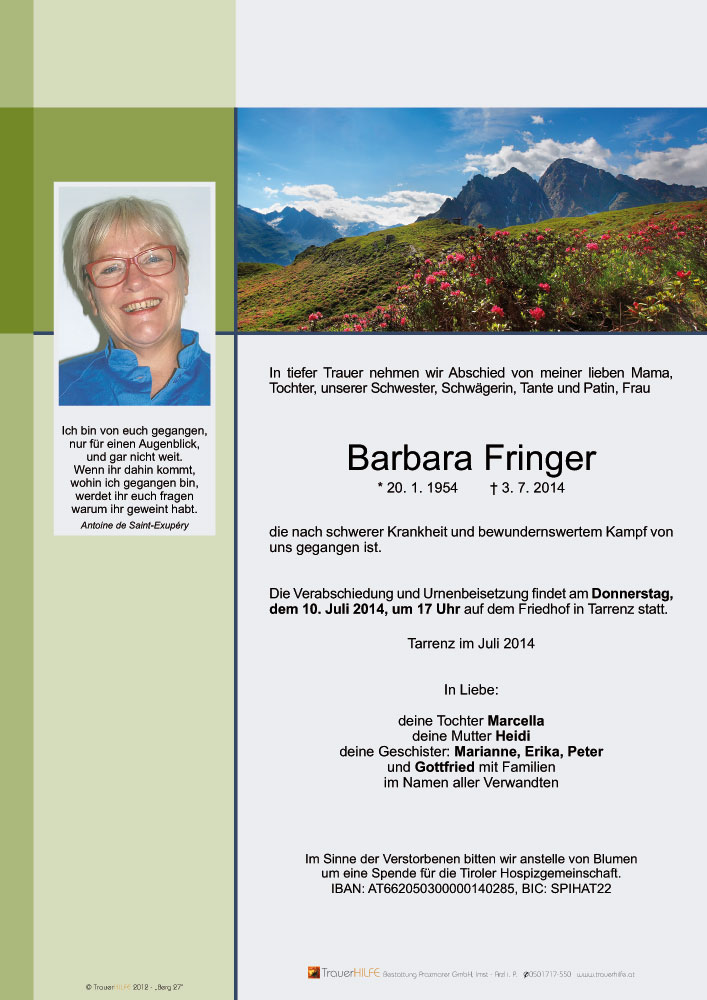 Es wird Stille sein und Leere. Es wird Trauer sein und Schmerz. Es wird dankbare Erinnerung an Barbara sein. Ich wünsche Dir und Deiner Familie viel Kraft und Gottvertrauen in dieser schweren Zeit des Abschieds. In stillem Gruß und aufrichtiger Anteilnahme. Aurelia08.07.2014 22:49 - Aurelia Kundmann