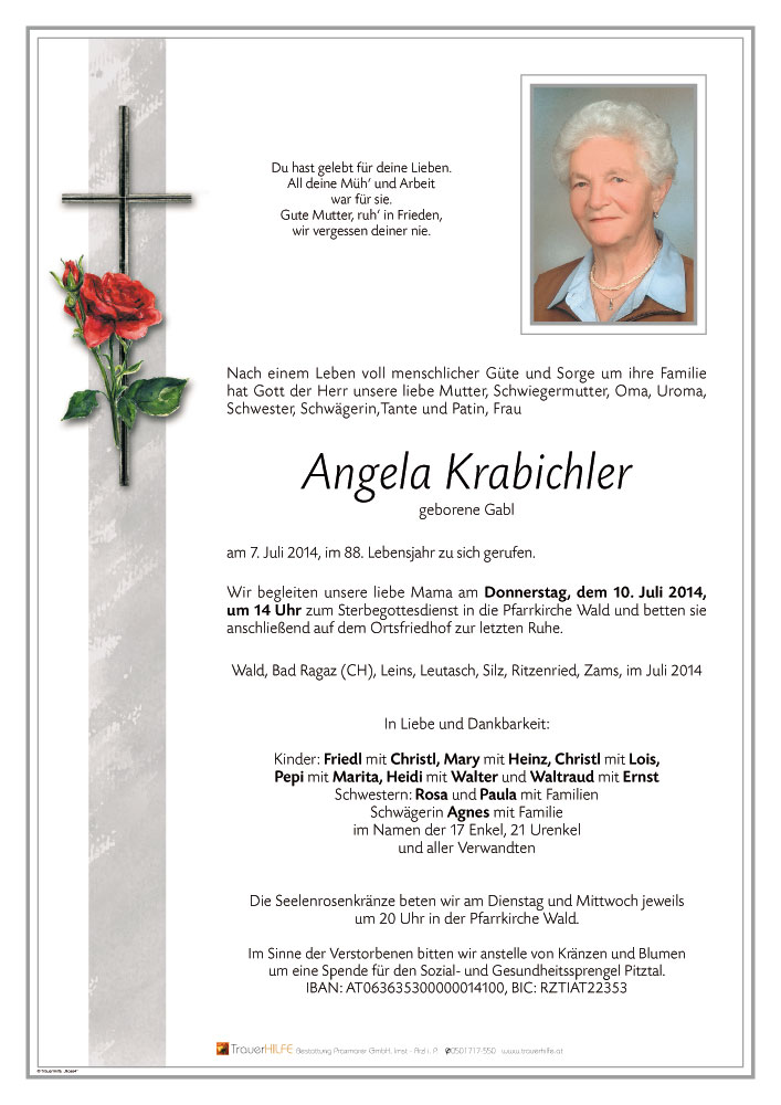 Zum Heimgang von Angela möchte ich euch mein herzliches Beileid ausdrücken und wünsche euch allen viel Kraft für die schwere Zeit!09.07.2014 07:19 - Manuel Santer