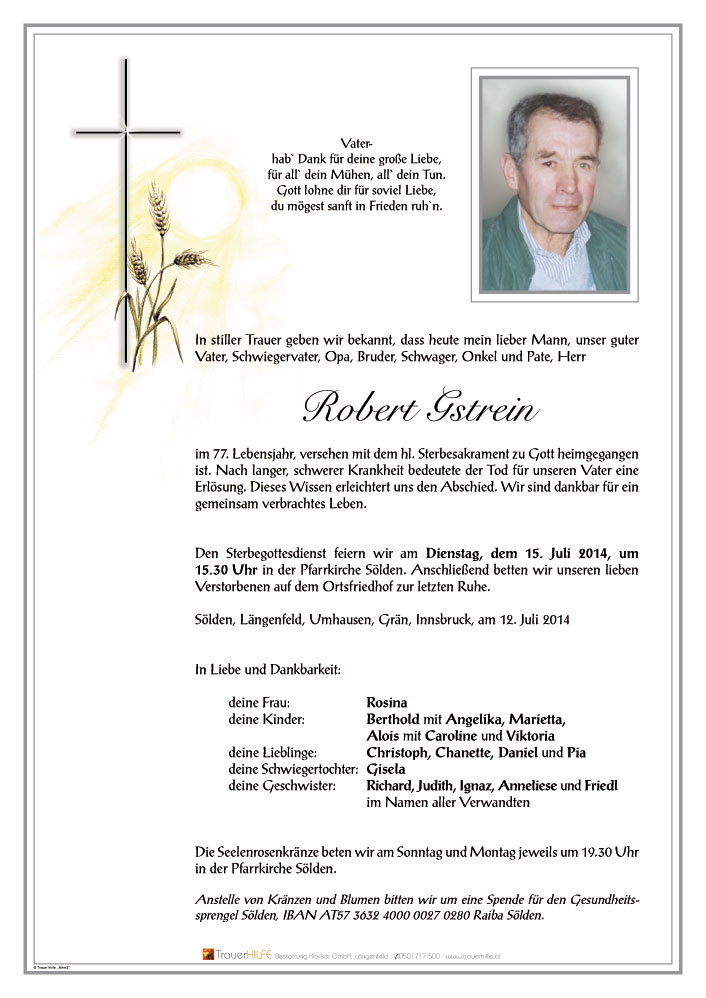 Du hast mich auch gleich an der Stimme erkannt wenn ich zu Besuch war im Elternhaus meiner Mama. Immer wieder hast du von deinen Tieren erzählt. Du warst halt ein Bauer aus Leidenschaft. Oft habe ich deine Bescheidenheit und Geduld bewundert mit der du deine Krankheit getragen hast. Jetzt aber hast du deinen Frieden gefunden den wir dir alle von ganzem Herzen gönnen . Pfiti Robert und Ruhe in Gottes ewigen Frieden .