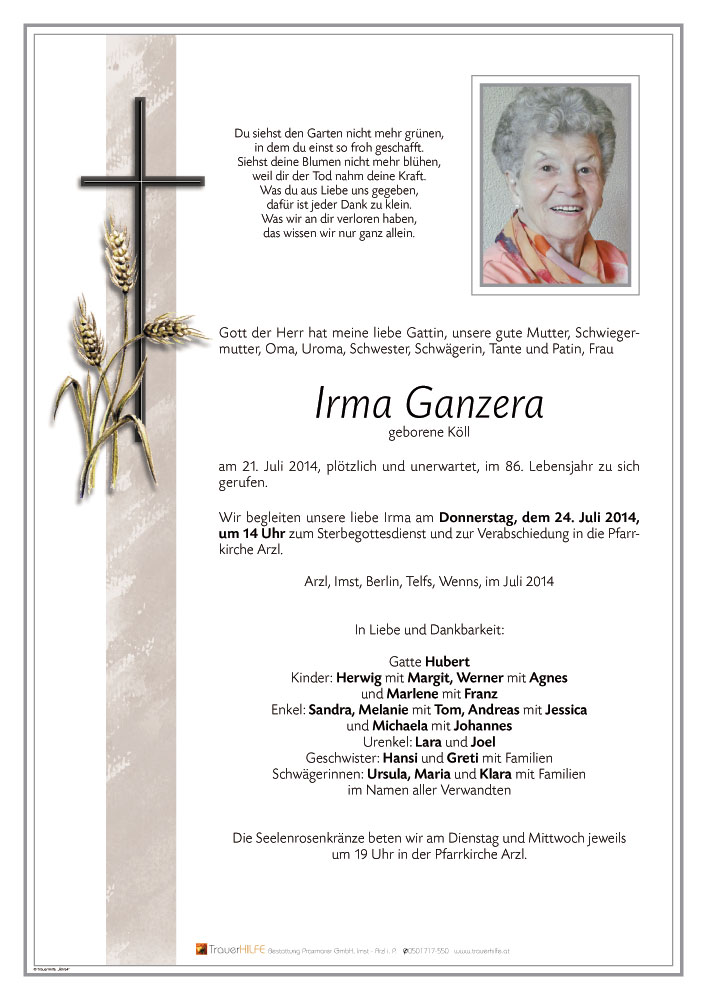 Neue Kerze für Irma Ganzera entzünden.