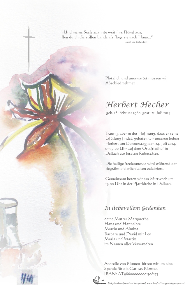 Du wolltest mich nochmal besuchen kommen in Heiligenblut und wolltest im Herbst mit mir nach Graz fahren.Nun ist es leise geworden. Keiner ruft mich mehr an nach Mitternacht.Du wirst mir fehlen und ich verspreche Dir, das ich unser gemeinschaftliches künstlerisches Tun und Schaffen jetzt erst recht voranbringen werde. Ich bin stolz dich kennengelernt zu haben und über viele Jahre dein Mentor sein durfte.Du sagtest:`` Ich bin durch Dich zur Malerei gestossen vor nun mehr als 20 Jahren.``Das hat mich sehr geehrt und Du hast mitunter ein grosses Werk hinterlassen.Lieber Herbert, ruhe in Frieden ,dein Freund und Künstler Klaus Ackerer