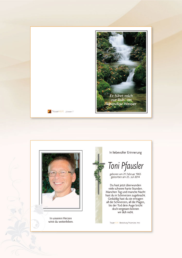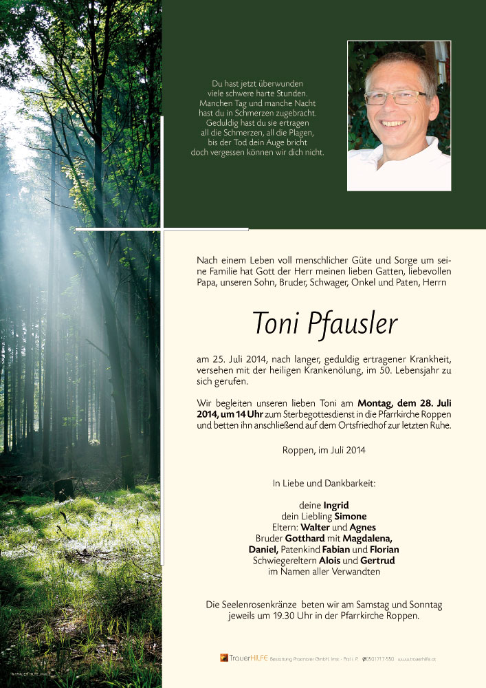 Wo Worte fehlen, das Unbeschreibliche zu beschreiben, wo Augen versagen, das Unabwendbare zu sehen, wo Hände das Unbewegliche nicht fassen können, bleibt einzig die Gewissheit, dass Toni immer in Euren Herzen fortleben wird.