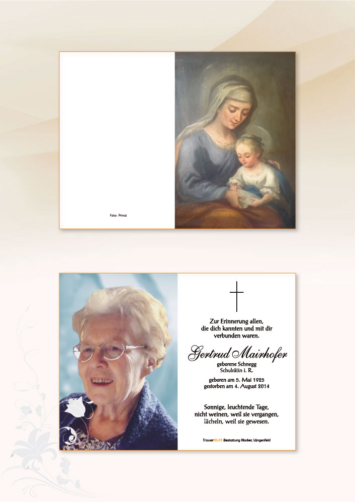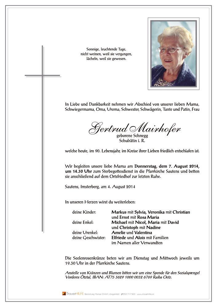 Aufrichtige Anteilnahme am Tod eurer lieben Mutter entbietet Karla Fuchsberger (Schöpf) aus Landeck07.08.2014 09:02 - Fuchsberger Karla ( Schöpf )