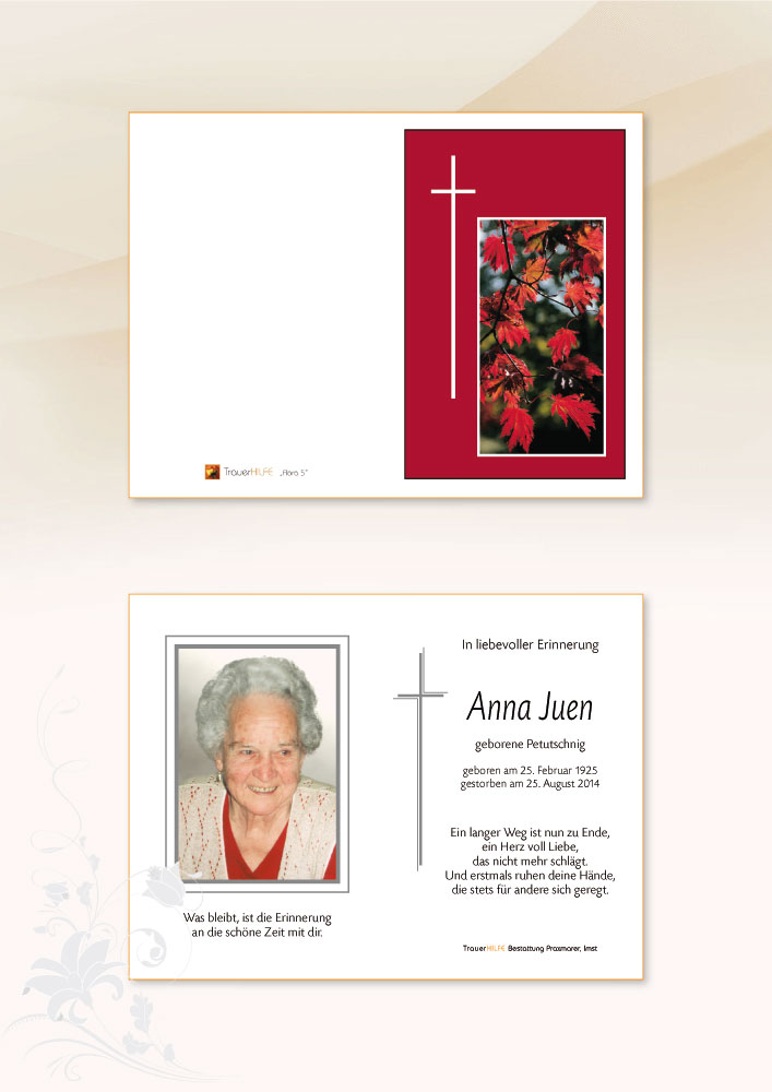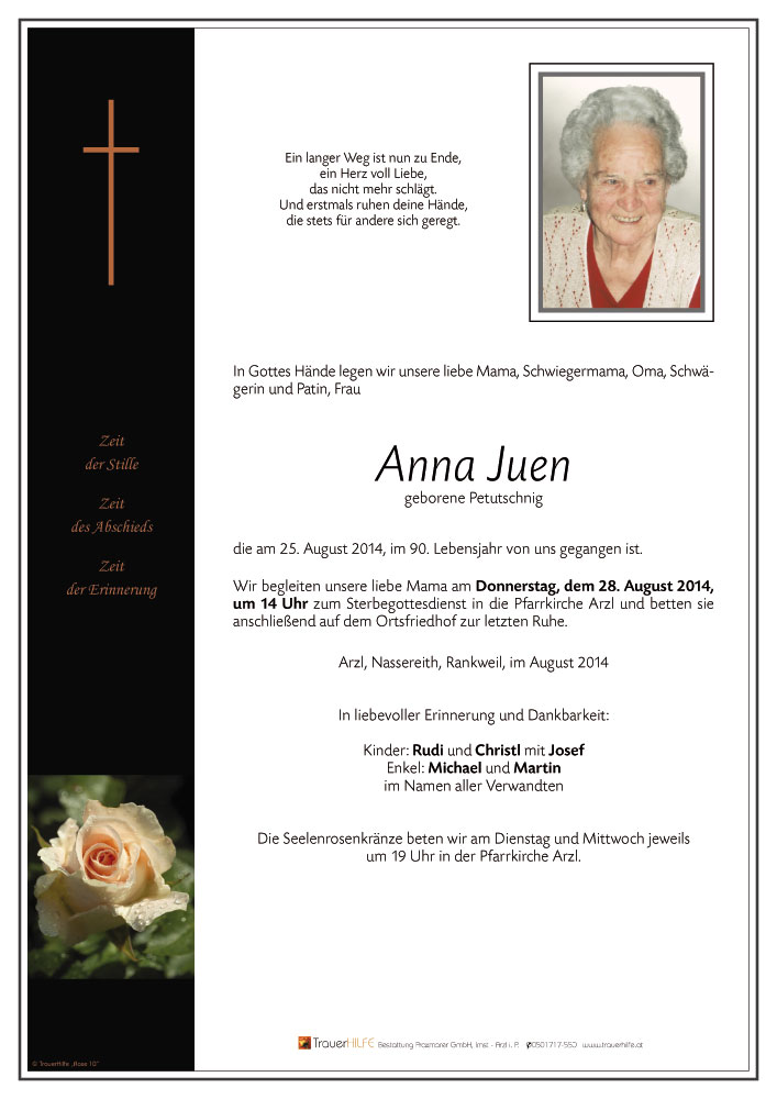 • Herzliche Anteilnahme zum Heimgang eurer lieben Mutter entbietet Familie Juen Brennwald