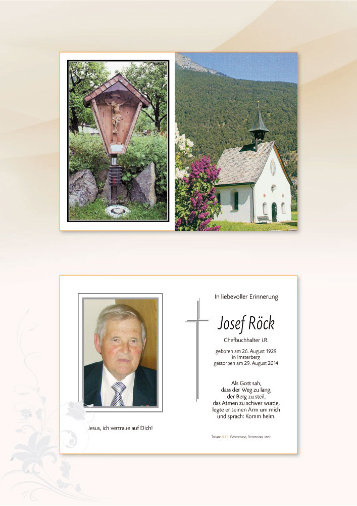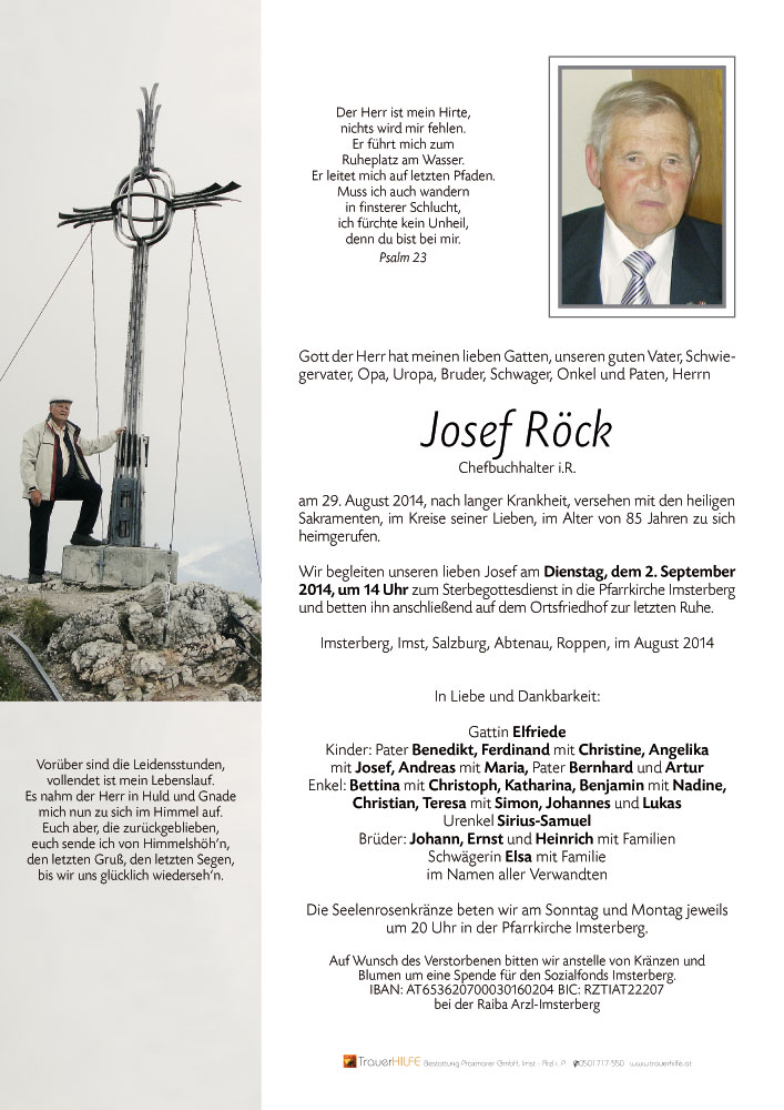 Der Familie Röck insgesamt und unseren beiden Hw. Herrn P. Benedikt u. P. Bernhard im speziellen möchten wir das aufrichtige Mitgefühl und Anteilnahme anlässlich des Todes vom Gatten und Vater aussprechen. Der Segen Gotten möge euch Trost und Beistand sein, der Himmel wird euren lieben Vater offen stehen und er kann den ewigen Frieden empfangen.