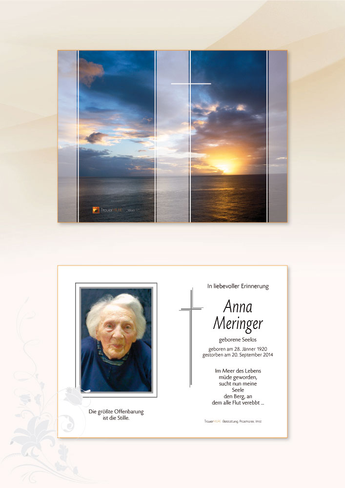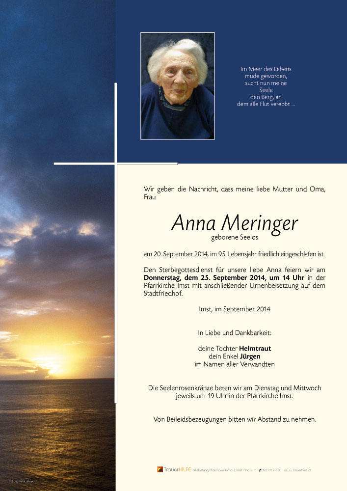 Leider ist es mir nicht moeglich, "Anni" nochmals zu begleiten. Bin im fernen Osten und meine Erinnerungen werden nun wachgeruettelt. Denke nun in irgendeinem Tempel an Eure Mutter und werde ein paar Raeucherstaebchen anzuenden. Hoffe sie hat ihren Frieden den sie auch verdient hat.