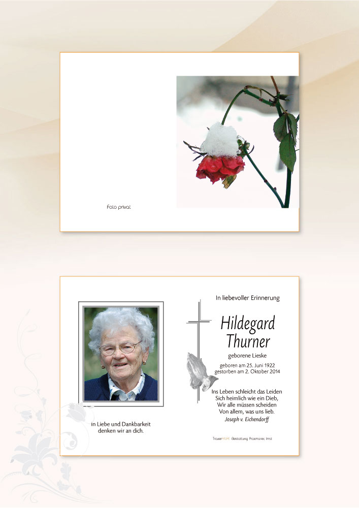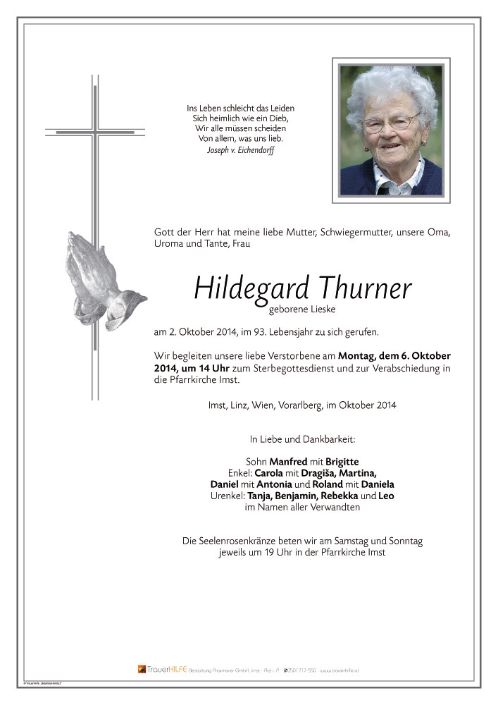 Soeben habe ich hier erfahren, dass Deine liebe Mutter, meine pommersche Nachbarin, gestern Ihre Augen für immer geschlossen hat. Ich möchte Dir und der Familie Deiner verstorbenen Schwester meine herzliche Anteilnahme, heute auf diesem Wege, zukommen lassen. Es war ja nie in Euren Gedanken, wie ich weiß, aber immer in meinen, dass sie wie ich aus Pommern nach Imst gekommen war.