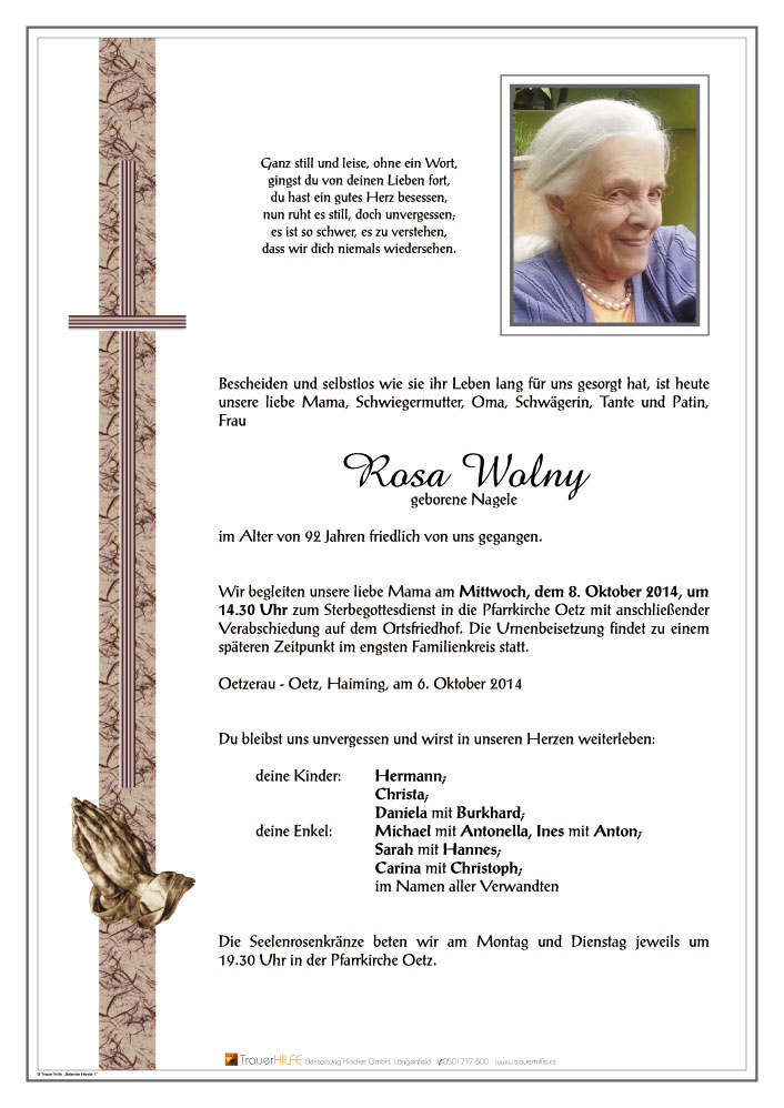 Mit einem "Amen", einem "so sei es" verabschieden wir uns, liebe Rosa, nun von ein letztes Mal von dir, deine MitarbeiterInnen und Ehrenamtlichen vom Wohn- und Pflegezentrum Ötz.08.10.2014 00:24 - Wohn- und Pflegezentrum Ötz