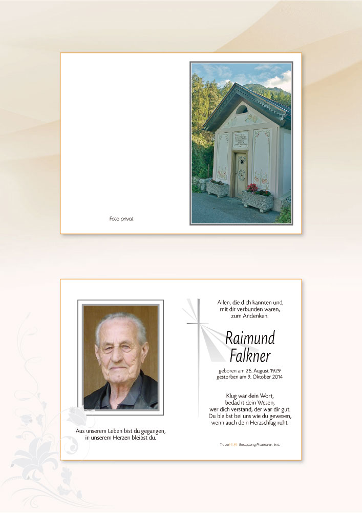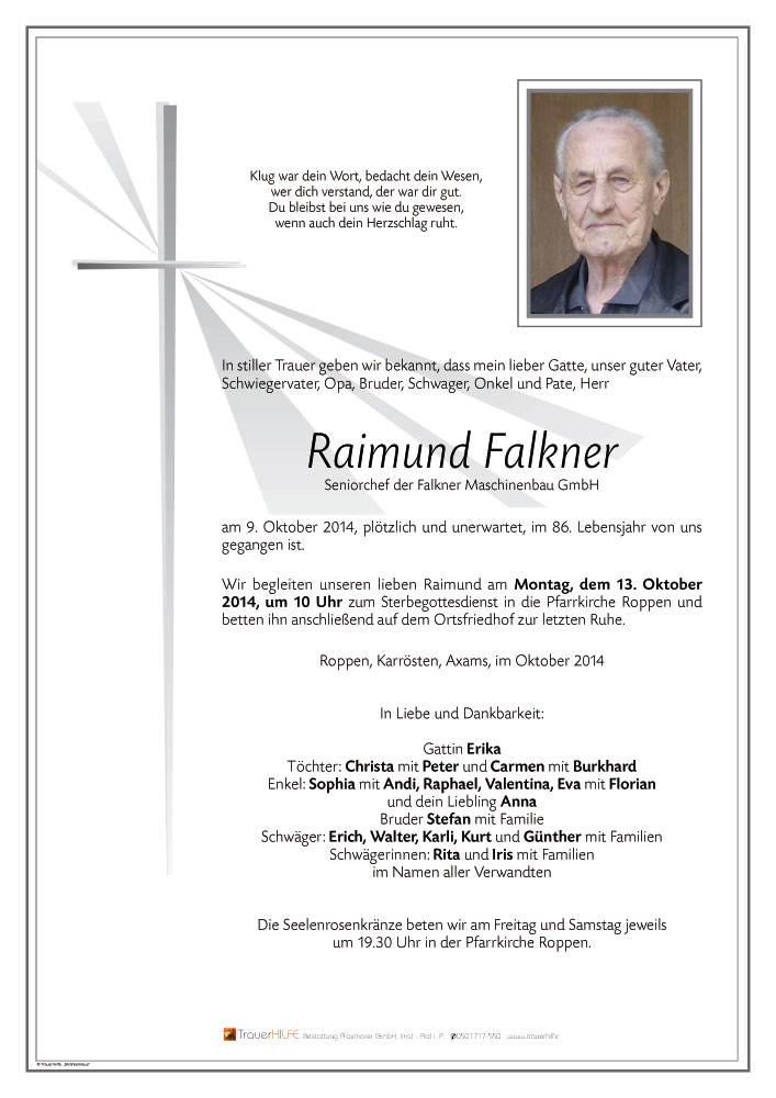 ich habe Herrn Raimund Falkner schon vor vielen Jahren kennen und schätzen gelernt. Meine Familie und ich entbieten Ihnen deshalb auf diesem Wege unser herzliches Mitempfinden!10.10.2014 10:30 - Peter Valtingojer