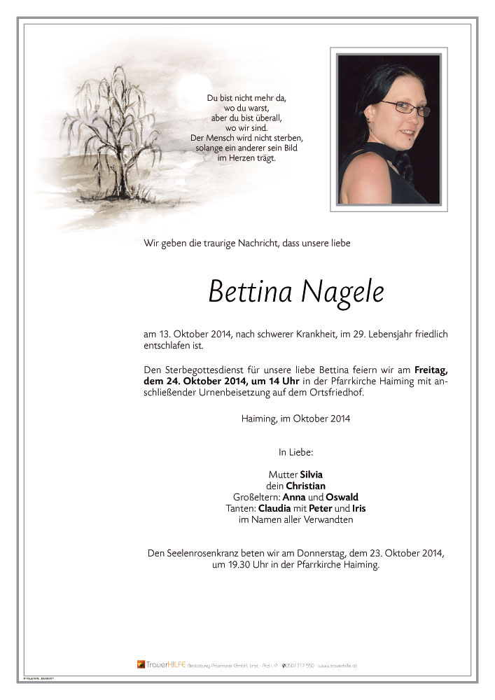 Trennung und Abschied gehören in unser Dasein. Bettina ist uns vorausgegangen, befreit von Schmerz und Leid.