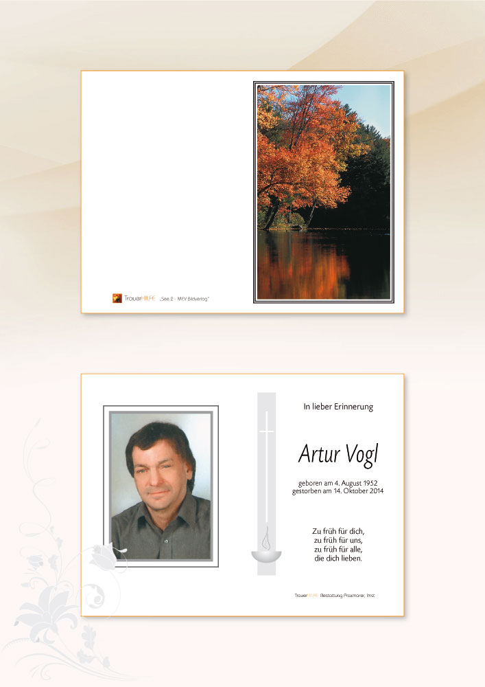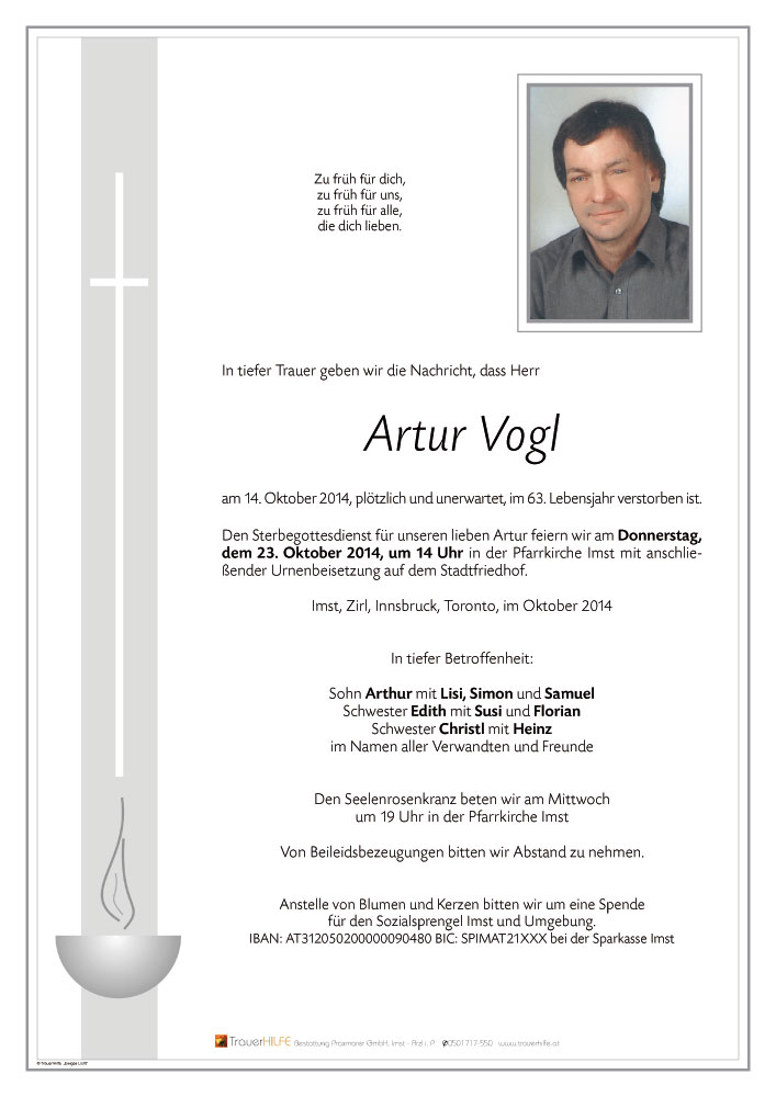 Liebe familie Vogl Leider kann ich an der Verabschiedung meines lieben Schulkollegen und Nachbarn Arthur nicht teilnehmen - so kann ich Euch nur auf diesem wege kondolieren und euch auch alles gute wünschen. Euer Gebi Schatz vom Hennewinkl