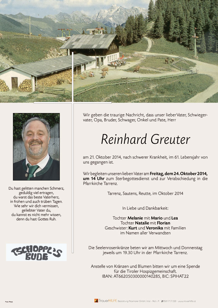 Wir haben mit dem Reini viele schöne und lustige Stunden in Berwang verbracht.Unser Zwischenstopp in Tschoppl`s Bude war immer ein MUSS.Er lebt in unseren Gedanken immer mit .