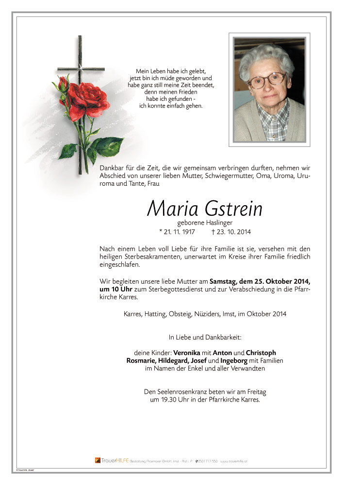 Bestattung wurde durchgeführt von: Daniel Klocker Bestattung Praxmarer GmbH Thomas Walch Str. 4 6460 - Imst Tel.: 05412 64250 zum Bestatter