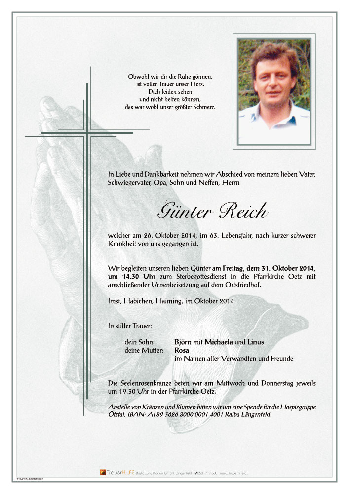 Wir wünschen euch aber auch liebe Menschen an eurer Seite, die euch nahe sind und die euch beistehen, damit ihr nach dieser schweren und dunklen Zeit des Abschieds und der Trauer wieder Liebe, Licht und Hoffnung zum Weitergehen findet.