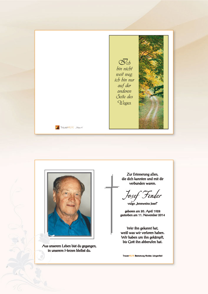Weinet nicht, ich hab es überwunden, bin befreit von meiner Qual, doch lasset mich in stillen Stunden bei euch sein so manches mal. Was ich getan in meinem Leben, ich hab es gern für euch getan, was ich gekonnt, hab ich gegeben, als Dank bleibt einander zugetan.