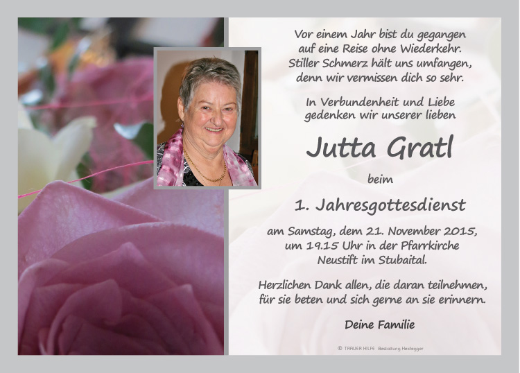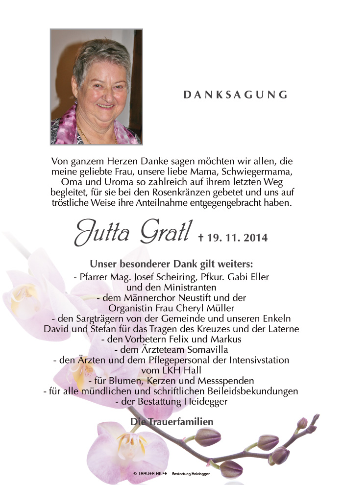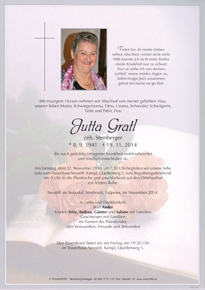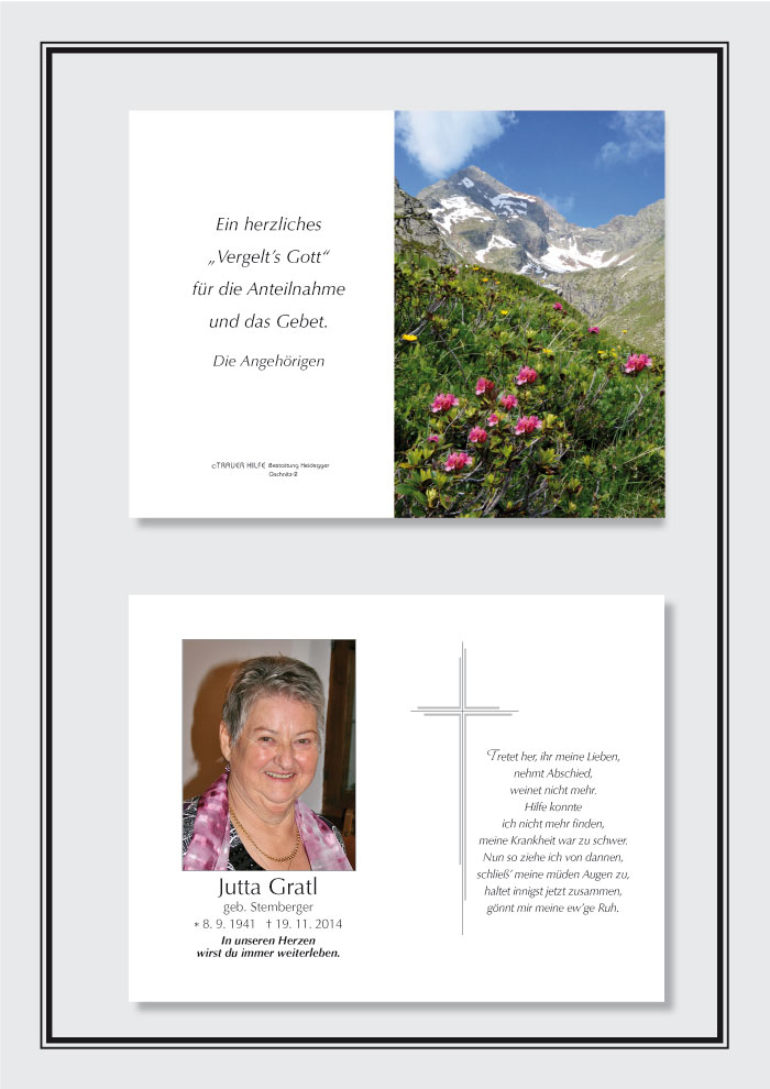 Wie dornenreich war deines Lebens Bürde,wie tränenreich dein teures Mutterherz! Du trugst das Leben christlich still, mit Würde, du warst in Gott ergeben auch im Schmerz. Ein trost nur ist: Wir seh\'n uns einstens wieder und werden dauernd dort vereinigt sein.