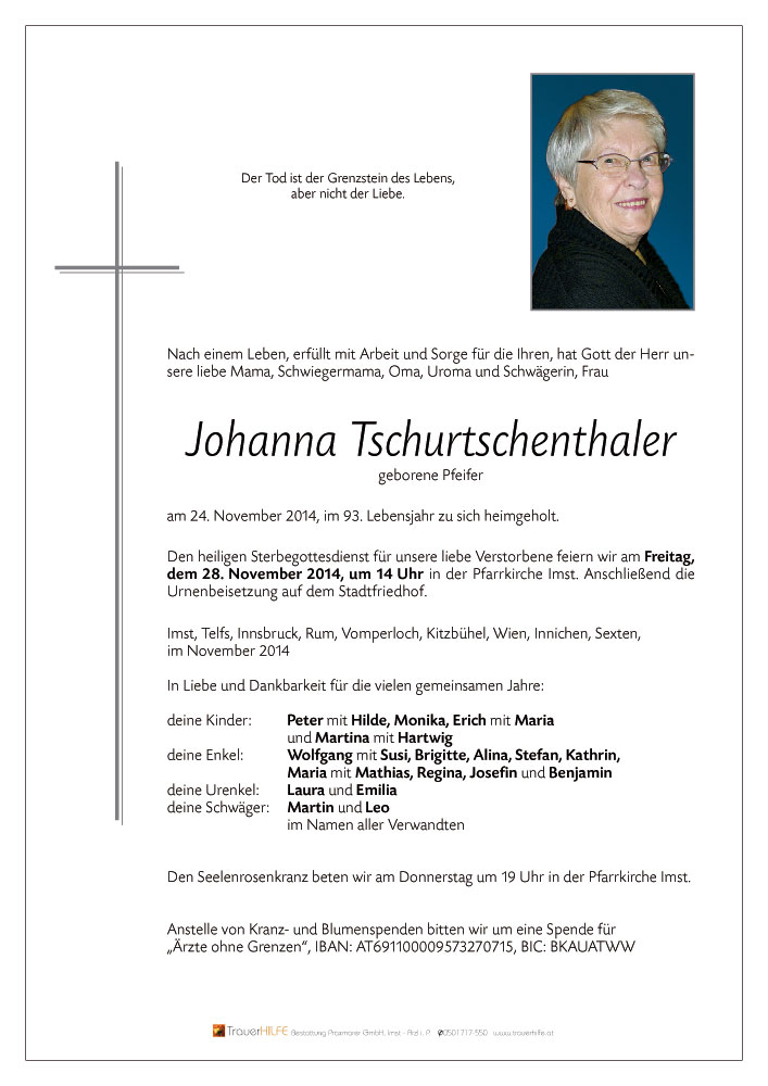 Am Heimgang eurer lieben Johanna möchten wir euch allen unser aufrichtiges Beileid aussprechen! Möge euch der Herrgott viel Kraft schenken in dieser schweren Zeit!