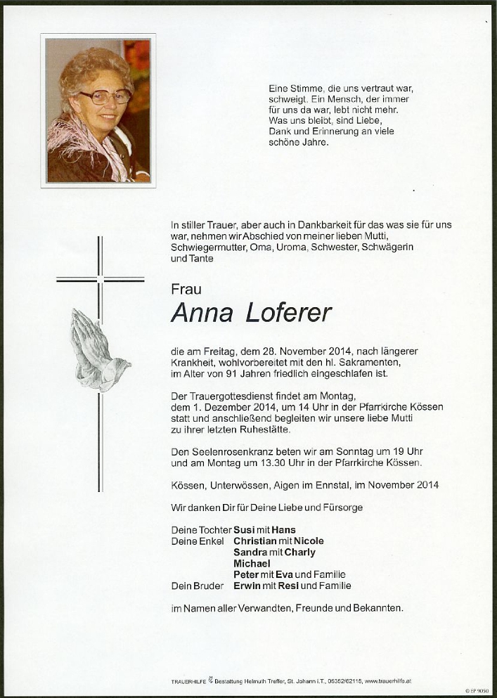 Wir hatten nie viel Geld und doch hast du uns zu den reichsten Menschen gemacht durch deine Liebe. Obwohl man dir die Krankheiten ansah, hast du dich nie beklagt über Schmerzen, denn du kanntest nur Sonnenschein. Du hast mir gezeigt wie man das Leben geniesst und nicht nur arbeitet, trotz der Tatsache, dass du alles und nichts hattest. Im Krieg sowie jetzt kurz vor dem Paradies. Je mehr man an die Vergangenheit denkt und an unsere schöne gemeinsame Zeit, desto größer wird das Loch, dass deine Abwesenheit in meinem Herzen hinterlässt. Ich hoffe dir geht\'s jetzt gut und du siehst diejenigen wieder, die uns so früh verlassen mussten.