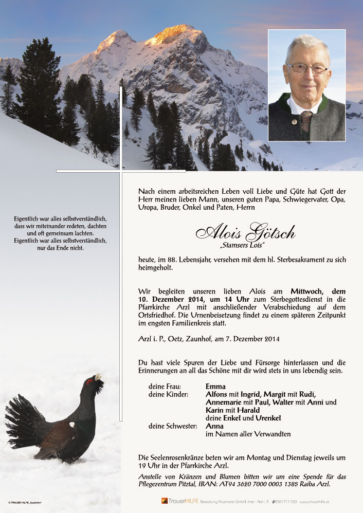 Zum Heimgang von Alois möchte ich euch mein herzliches Beileid ausdrücken und wünsche euch allen viel Kraft in dieser schweren Zeit!09.12.2014 21:03 - Manuel Santer