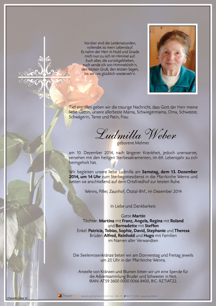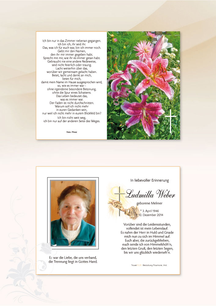 Es gibt eine Brücke zwischen den Lebenden und jenen, die uns vorausgegangen sind. Es sind dies die steten Erinnerungen an ihr Lachen, ihre Wärme, ihre Sorge und Güte, ihre Herzlichkeit. Ludmilla hat durch ihr vorbildliches Leben unauslöschbare Spuren in unseren Herzen hinterlassen. So wollen wir euch in diesen schweren Stunden diesen Blick auf das kostbare Vermächtnis eurer/unserer Ludmilla wünschen.