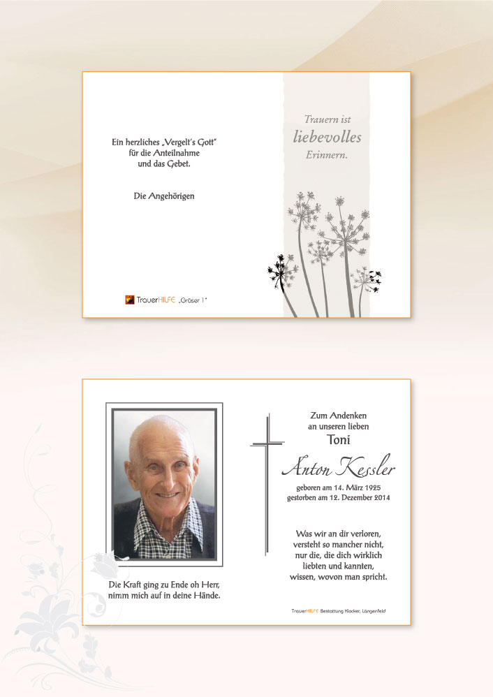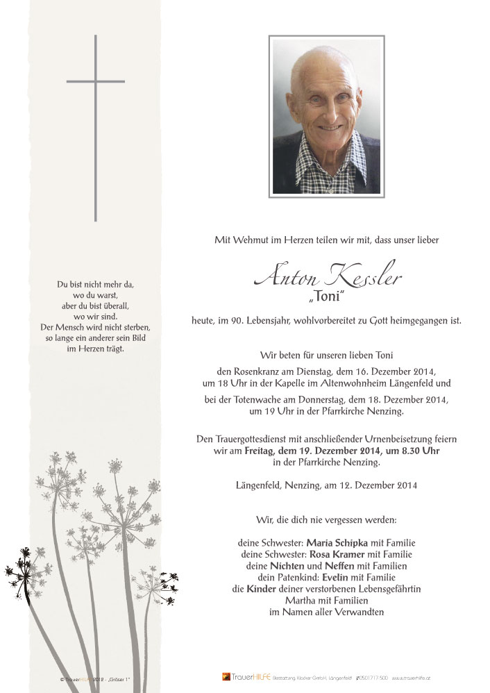 Bestattung wurde durchgeführt von: Daniel Klocker Bestattung Klocker GmbH Oberlängenfeld 41 6444 - Längenfeld Tel.: 05253 5561 zum Bestatter