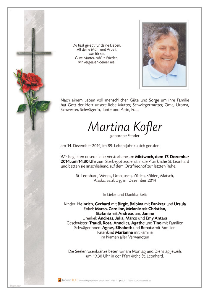 Zum Heimgang eurer lieben Mutter Martina möchte ich euch mein herzliches Beileid ausdrücken und wünsche euch allen, viel Kraft für die schwere Zeit!17.12.2014 22:41 - Manuel Santer