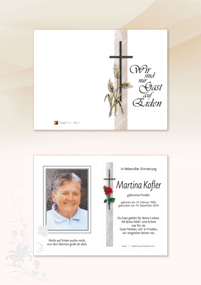 Was du hast gegeben, dafür ist jeder Dank zu klein, du hast gesorgt für deine Lieben von früh bis spät, tagaus, tagein. Du warst im Leben so bescheiden, viel Müh\' und Arbeit kanntest du, mit allem warst du stets zufrieden, nun schlafe sanft in ewiger Ruh\'.