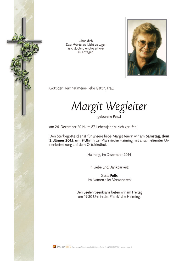 unsere aufrichtige Anteilnahme am Heimgang deiner Ehefrau Margit entbietet Renate mit Familie