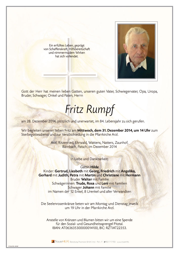 Auch wir sind voller Trauer, dass mit Fritz ein solch liebenswürdiger Mensch von uns gegangen ist und möchten euch unser tief empfundenes Mitgefühl aussprechen.29.12.2014 20:21 - Elfriede u. Hans Grader mit Mame
