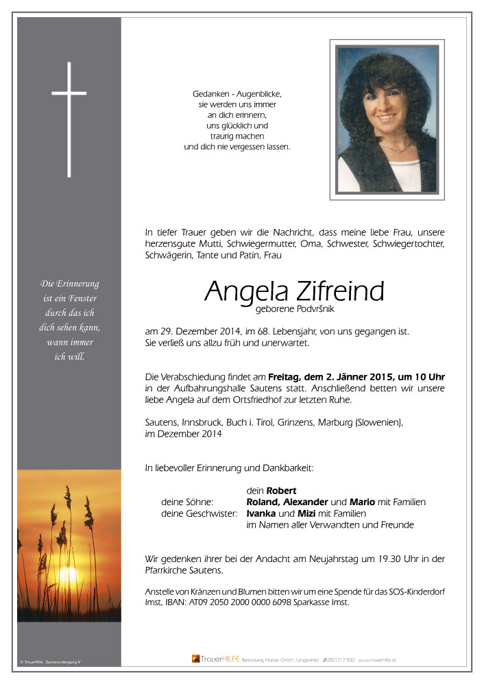 Zum Tode Eurer lieben Angela möchten wir Euch unser Beileid zum Ausdruck bringen. Gerne stehen wir Euch in diesen schweren Stunden zur Seite !