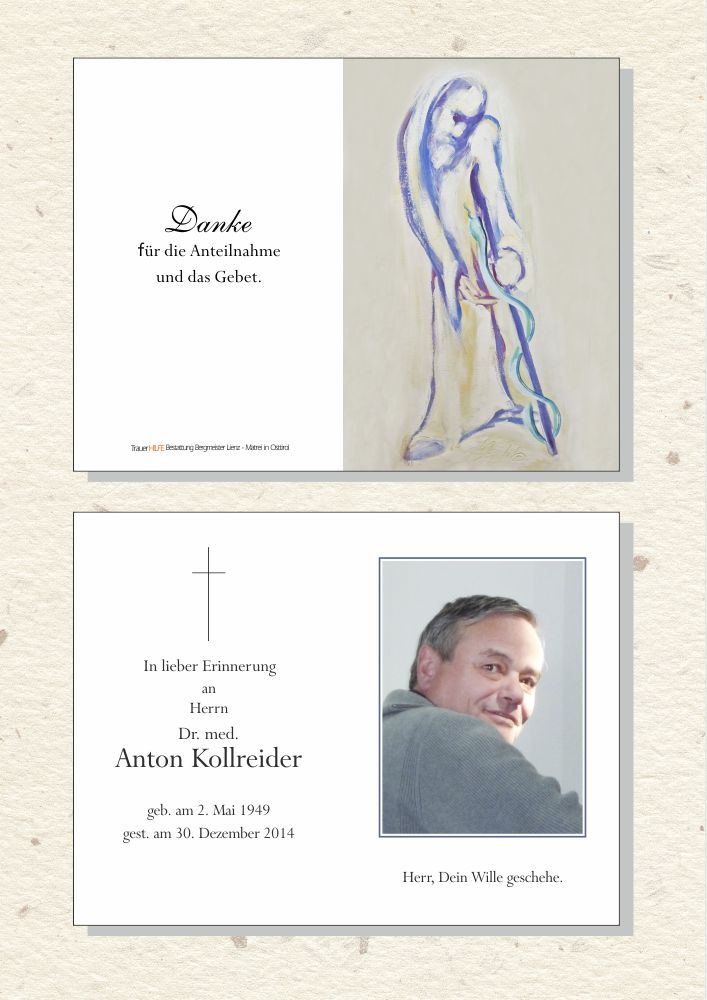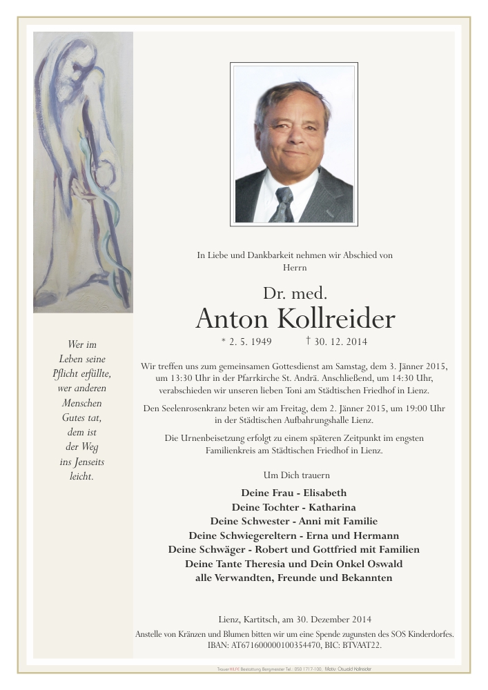 "Edel sei der Mensch,hilfreich und gut" - Dr. Kollreider war so wie Goethe es gewuenscht hatte. Immer hatte er ein gutes Wort fuer seine Patienten oder ihre Angehoerigen. Sein Laecheln brachte Licht ins Dunkel, er uebermittelte Vertrauen und gab Hoffnungsschimmer. Wir werden ihn nie vergessen und moechten seiner Frau Elisabeth und Tochter Katharina durch unsere Dankbarkeit ein wenig Trost schenken. Welch tiefe und unausloeschbare Spuren Toni hinterlassen hat, konnte man wohl an der Menschenmenge feststelllen, die sich beim Rosenkranz von ihm verabschiedete . Katharina und Elisabeth Ihr seid nicht ALLEIN , die Liebe und Dankbarkeit aller, die Dr. Kollreider kannten und schaetzten ist MIT EUCH. In dankbarer Erinnerung an einen wunderbaren Arzt und Menschen Helga und Toni Pasquale