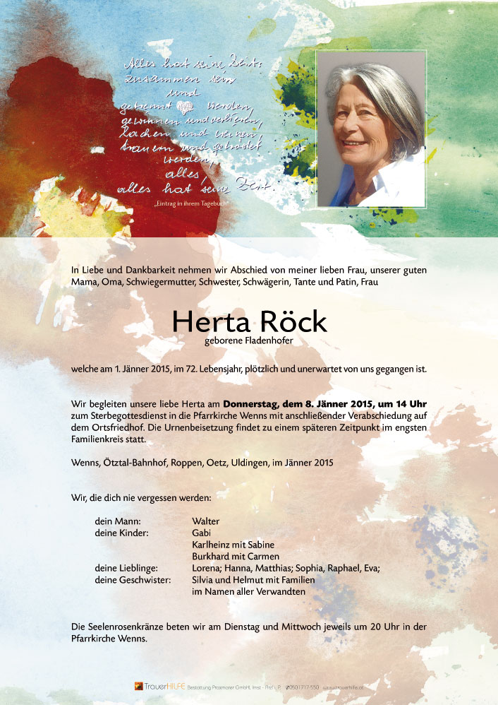 Tief betroffen vom plötzlichen Ableben von Herta möchten wir auf diesem Wege unser aufrichtiges Beileid aussprechen und wünschen euch viel Kraft und Zuversicht und Gottes Segen in dieser schweren Zeit des Abschiednehmens.