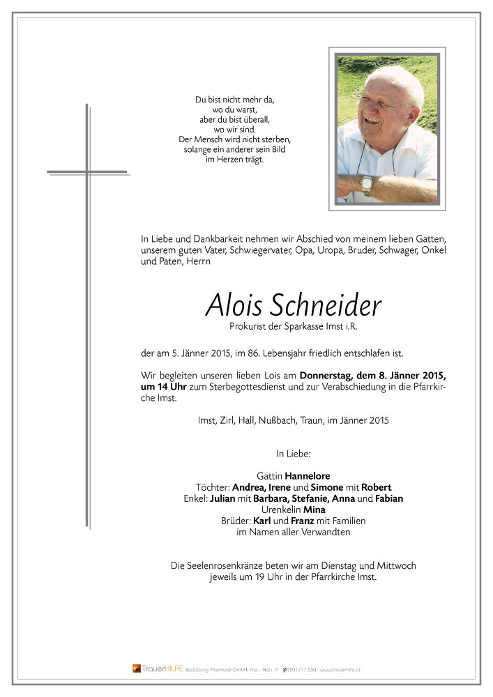 Liebe Hannelore,mein aufrichtiges Beileid,der Opa Lois war ein sehr feiner Mensch,ich werde ihn immer in guter Erinnerung behalten.Ich wünsch dir viel kraft,alles liebe Töne
