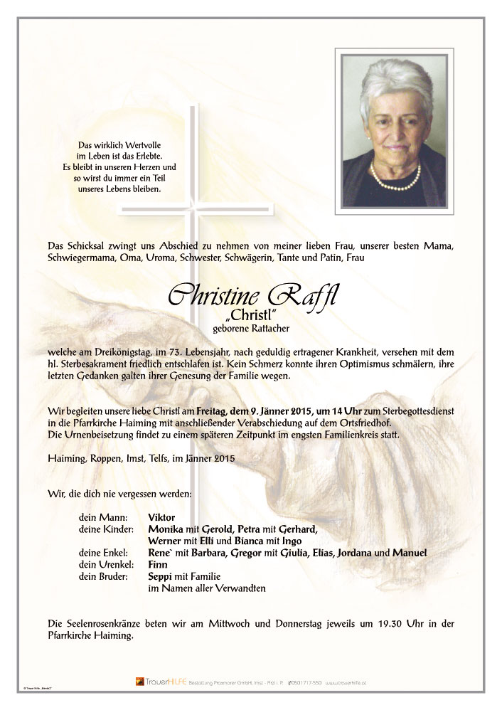 Wir danken dir, liebe Christl, für deine stets liebenswürdige Art und die netten und gemütlichen Gespräche am Gartenzaun. Möge Gott dir alles Liebe das du deinen Mitmenschen geschenkt hast vergelten. Ruhe in Frieden liebe Christl
