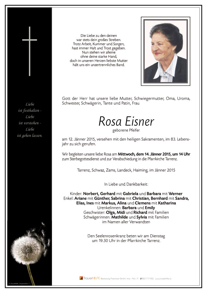 Ich möchte euch meine aufrichtige Anteilnahme am Tode Eurer Mutter mitteilen! Ich erinnere mich sehr gerne an ihr freundliches Wesen in meiner Jugend in Landeck!
