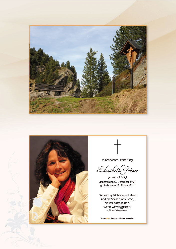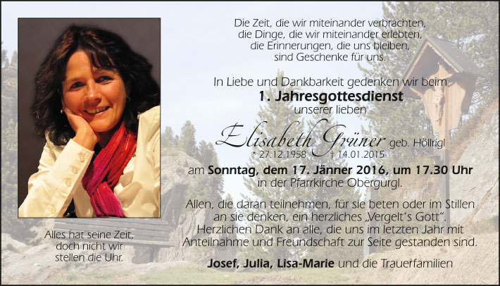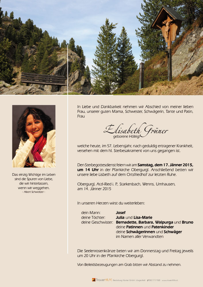Aufrichtige Anteilnahme am Ableben eurer geliebten Lisbeth, entbietet Fam. Ribis Toni aus Polling17.01.2015 11:49 - Fam. Ribis Toni aus Polling