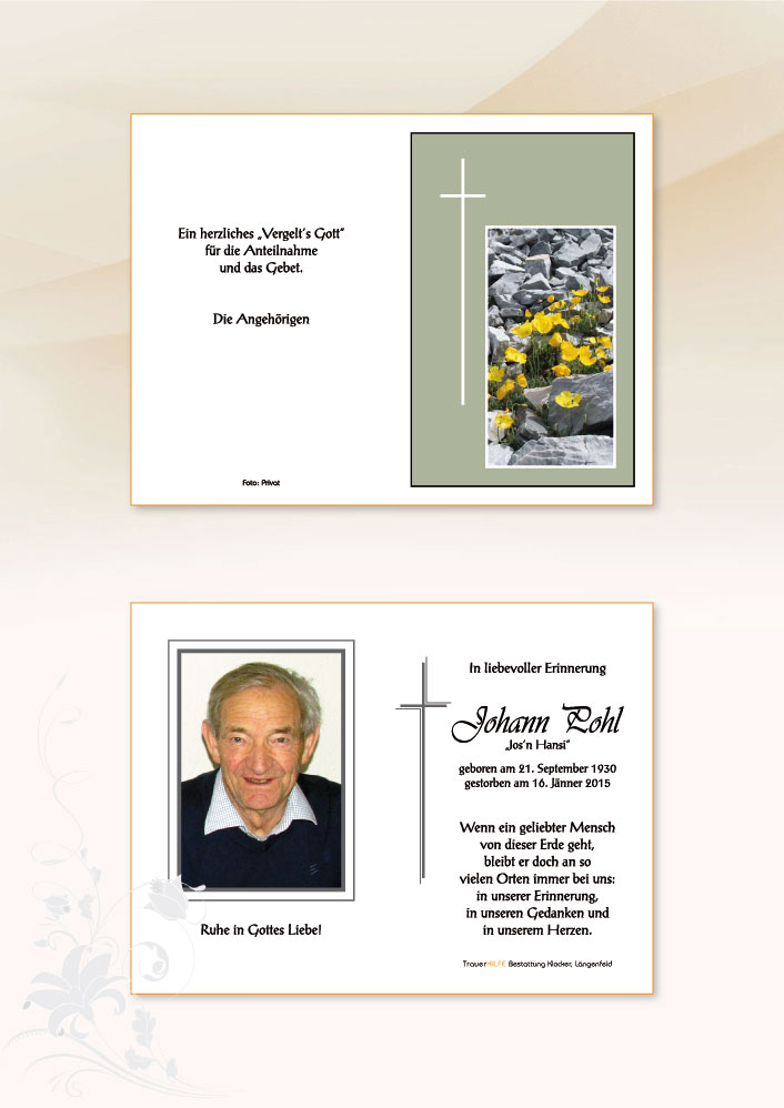 tief bedrückt vernahmen wir heute die traurige Nachricht vom Heimgang des Herrn Johann Pohl.