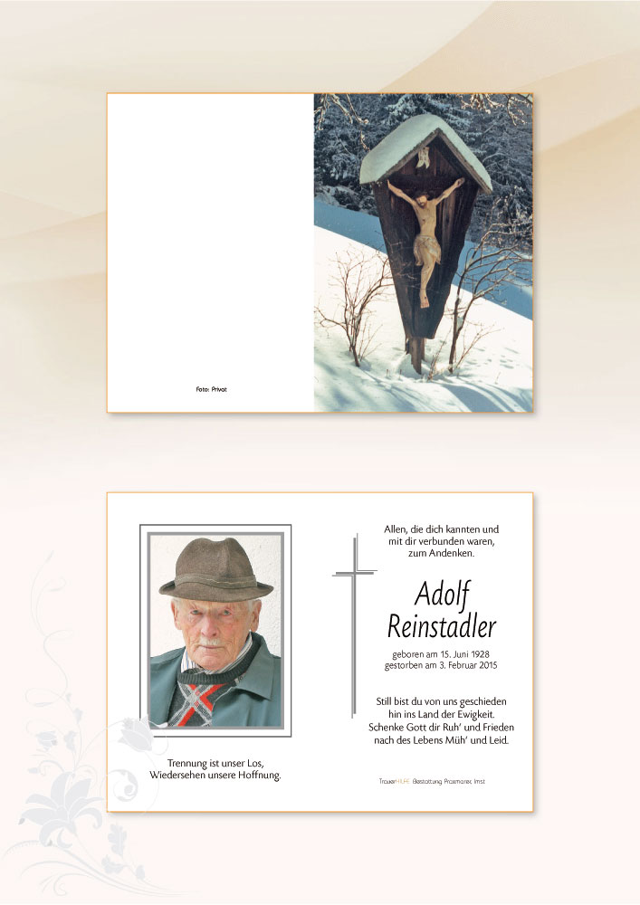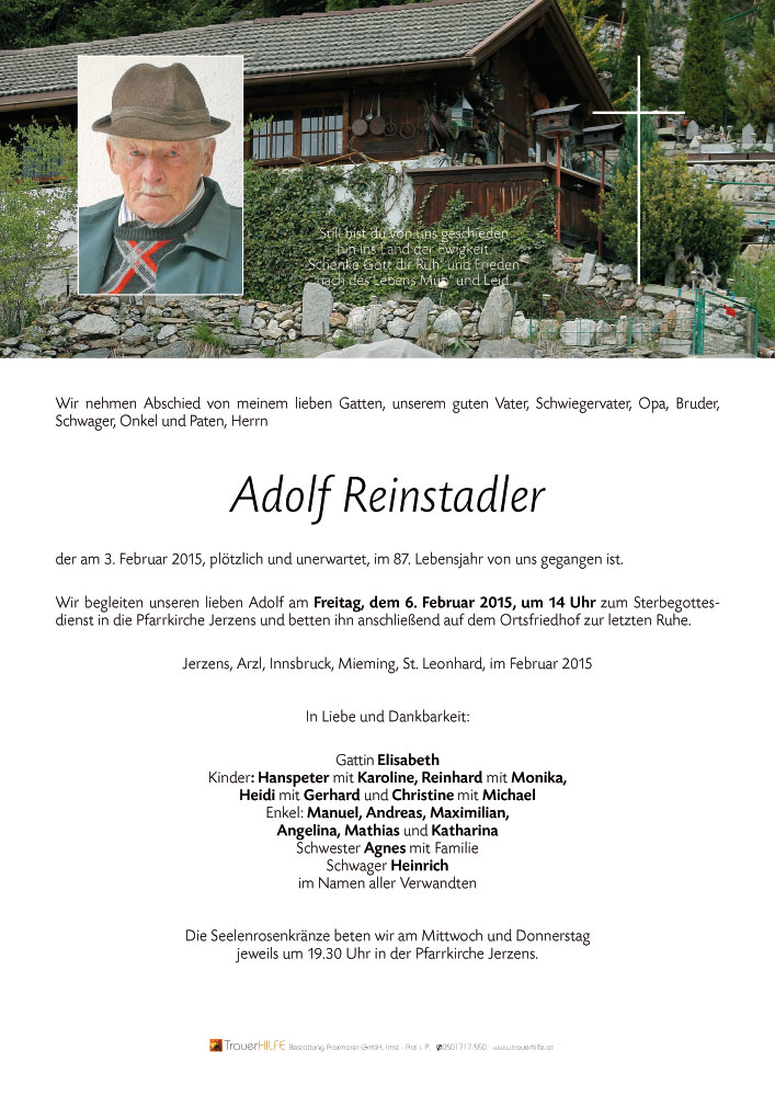 Herr bleibe bei uns,denn es will Abend werden,der Tag hat sich geneigt.Liebe Fam.Reinstadler,besonders Karoline und Hans Peter fühlt Euch umarmt.Herzliches Beileid Lechleitner Gisela.