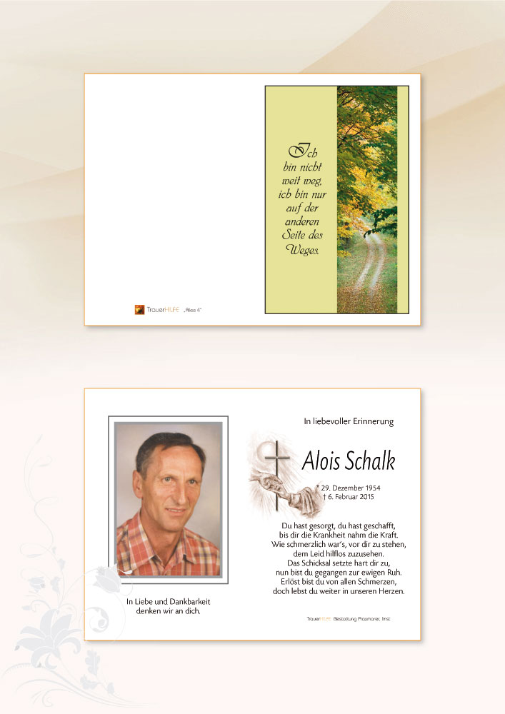 Man wird dich in deine ewige Heimat tragen, trauernd dich auf dem letzten Weg begleiten. Denn der Leib gehört zur Erde, und der Geist kehrt zu Gott zurück, der ihn gab.
